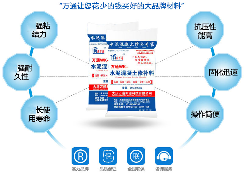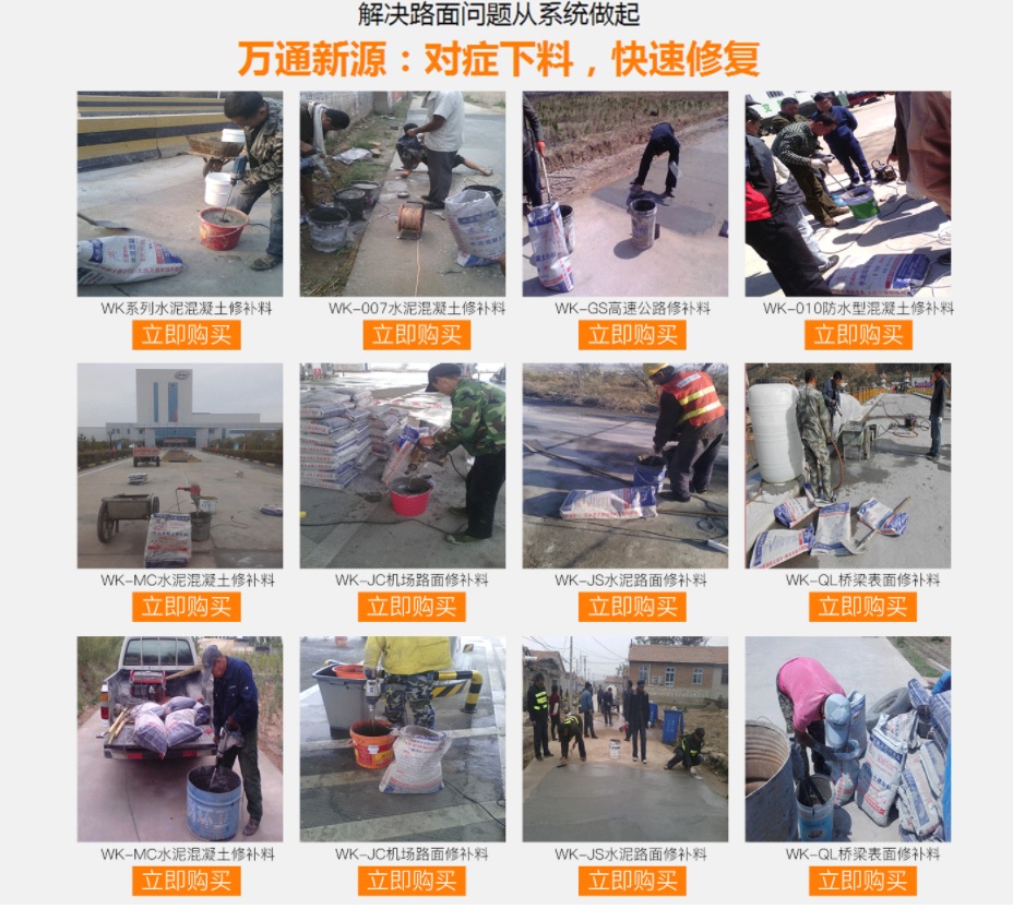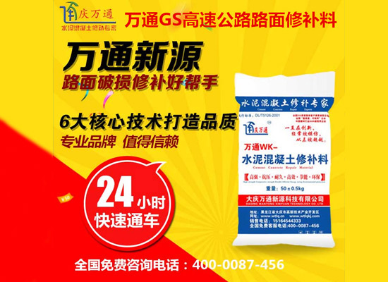 大慶萬通新源科技有限公司獨有的混凝土路面高強速補料,是水泥混凝土路面病害修復的好材料。疲勞、凍融循環(huán)、彎曲壓力、滲水和基層破壞等原因都會引起水泥路面的破損,從而帶來高昂的維護費用。與以往的剛性修補方法不同,混凝土水泥路面維修速補膠提供了一種獨特的柔性修補產(chǎn)品和技術,高柔性、高抗拉性,可跨伸縮縫施工和高抗壓性使得混凝土快補產(chǎn)品為水泥混凝土路面提供了******性的修補。傳統(tǒng)的剛性修補方案,如環(huán)氧砂漿和快干水泥產(chǎn)品,由于其自身的粘結(jié)失效,抗疲勞性低以及與原路面不同的伸縮系數(shù),修補面會在短時間內(nèi)失效或產(chǎn)生新的裂縫,需要反復修補,有效期短且費用高昂。大慶萬通新源科技有限公司的混凝土水泥路面維修速補膠可以隨原路面一起伸縮,移動,從而避免了粘結(jié)失效和產(chǎn)生新裂縫。萬通快補產(chǎn)品優(yōu)異的粘結(jié)性、柔韌性和高防滑性,特別適用于水泥路面的淺層粘合修補,多邊角混凝土板層修補,跨伸縮縫修補以及路面沉陷修補。萬通混凝土病害修補料針對混凝土起皮起沙、斷板裂縫、蜂窩麻面、坑槽露石子、漏筋掉皮、橋梁的掉皮漏筋快速通車使用時間長。應用萬通快補產(chǎn)品,施工后一天就可以恢復交通。大慶萬通新源科技有限公司的萬通水泥路面維修速補膠適用于高速公路、機場路面、農(nóng)村村村通路面、廠坪、學校操場、市區(qū)公路、小區(qū)路面、橋梁、水泥路面的修補。使用萬通特快補材料修補路面可以一勞永逸! 水泥地面起砂怎么辦,混凝土修補劑混凝土地面起砂,混凝土地面修補,地面起砂怎么辦,